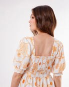 Vestido Artesano, con escote cuadrado, corte en la cintura, espalda con resorte, manga corta bombacha bolsillos laterales internos, con vuelo y al final una arandela.